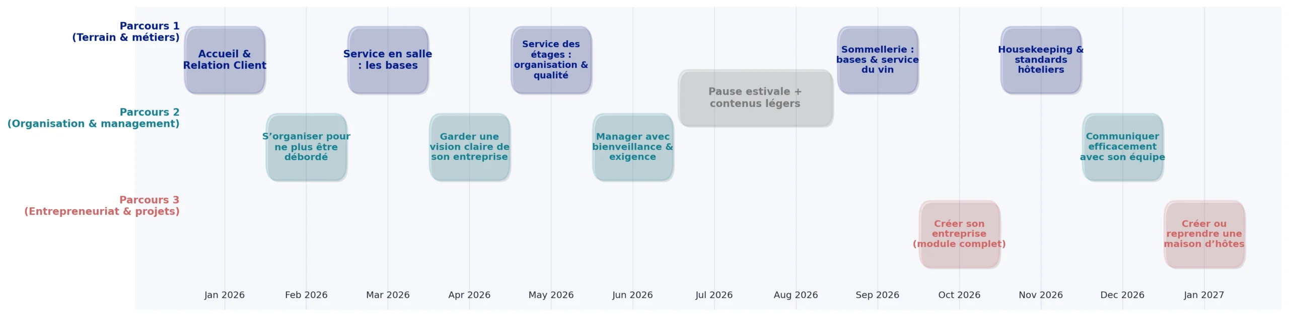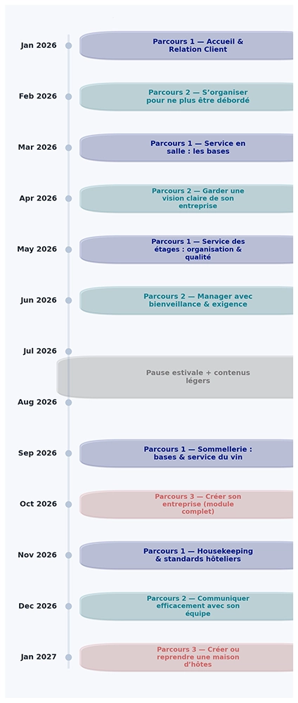 Ce programme évolutif pose les bases indispensables pour progresser durablement en hôtellerie-restauration. Il se déploie au fil des mois, avec un module publié chaque mois selon le calendrier annoncé ci-dessous :
